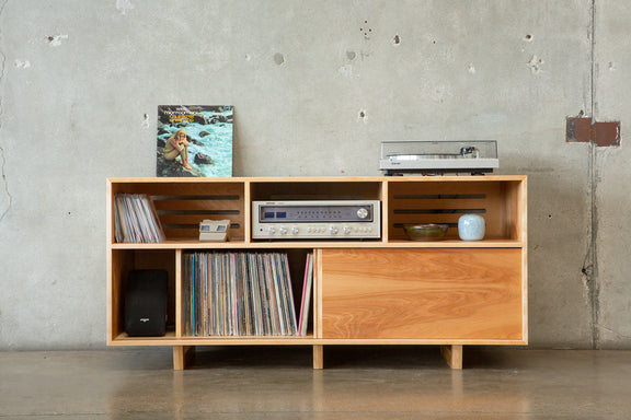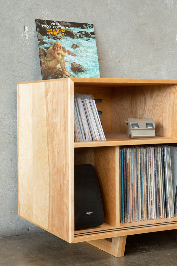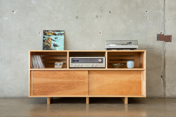 This birch stereo credenza is an original design with classic mid century modern lines. It features beautiful American natural birch with sliding doors below (protect those records from cats!) and open sections above. It has slatted openings in the back panel above for ventilation and 1" holes in the speaker sections on the bottom left and bottom right (although those sections could also be used to store more vinyl instead of speakers, or anything else you have in mind).