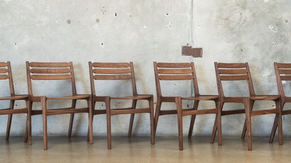 The Chairs are designed and crafted to perfectly compliment the table and feature half-lap joinery that will endure for generations. The chairs are approximately 31" tall, 19" wide, and the seat is 15" deep and 18" high. This listing is for the table and 6 chairs.