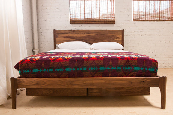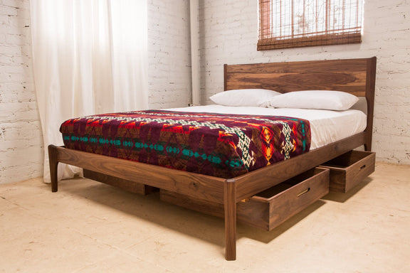 This bed features four drawers underneath that slide out to either side of the bed. Each drawer is approximately 6 inches tall, 28 inches wide, and 28 inches deep (for a queen, they are deeper on bigger beds). My design approach on the drawers is to keep them recessed behind the edge of the bed, and to have them floating off the ground, so that visually the bed does not feel bulky like most storage beds do. The drawers are built from solid wood, so that there is continuity between the bed and the drawers, and if someone does look underneath they'll see the same beautiful wood as elsewhere.