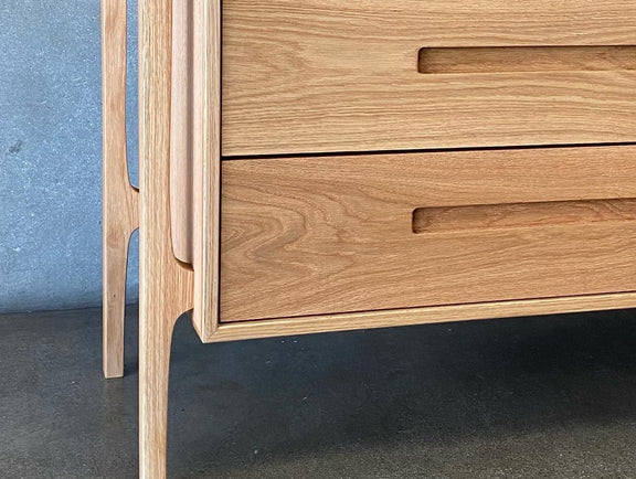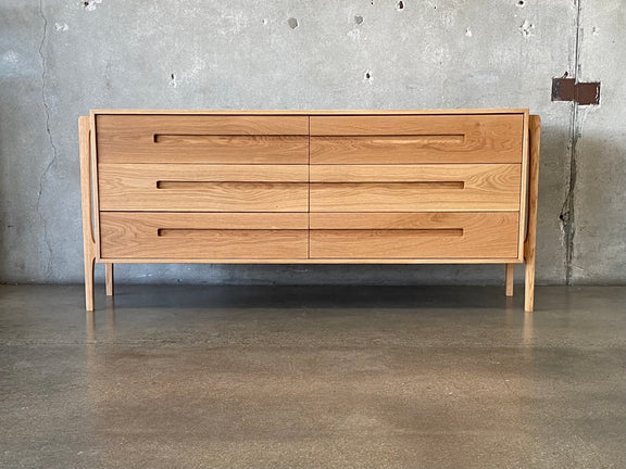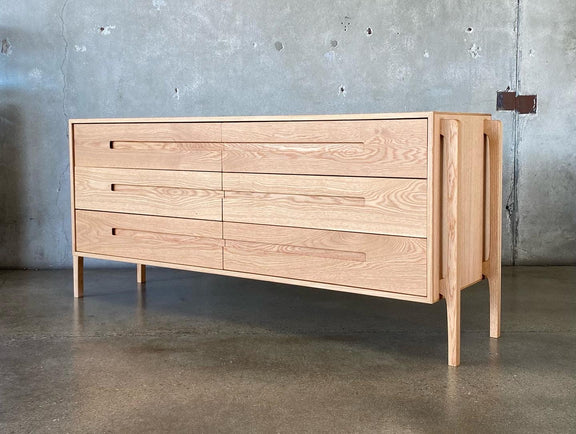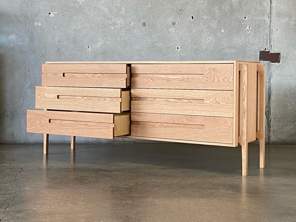 This dresser is an original Deeble design, with a strong Scandinavian/Danish Modern influence. The dresser pictured is in white oak, but it's available in any other species (i.e. walnut, cherry, mahogany, etc.).