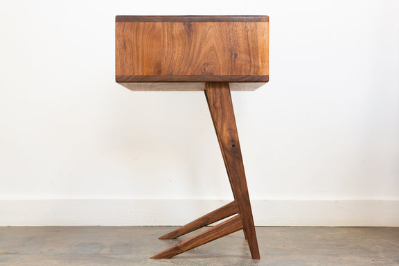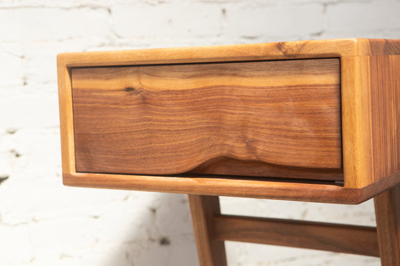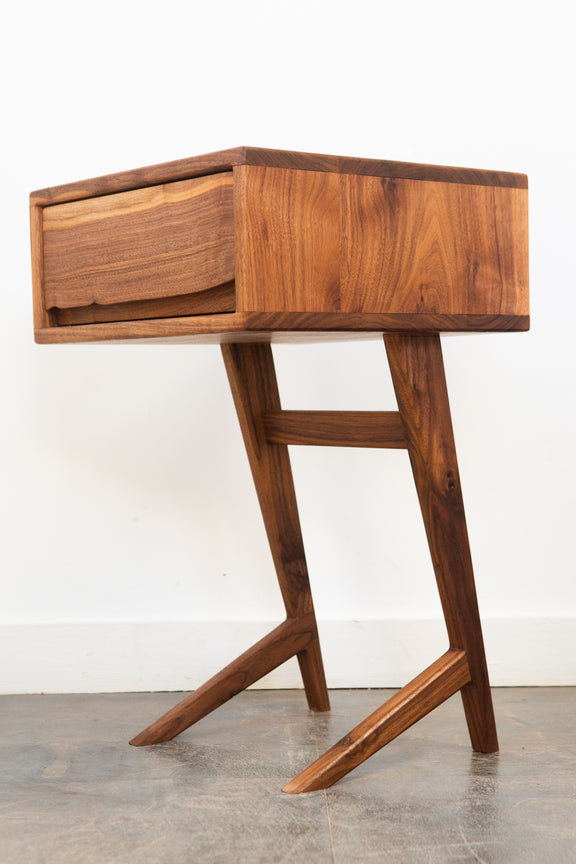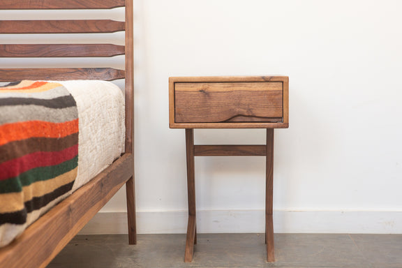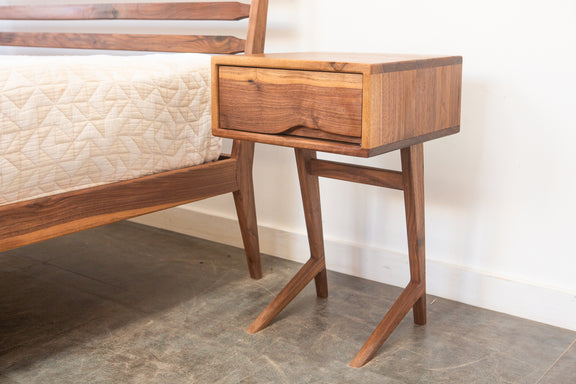 The Grace Nightstands are the newest nightstand design from Pete Deeble Furniture. They feature a cantilevered leg, which is elegant but which also allows you to see the detail of the back bed leg.