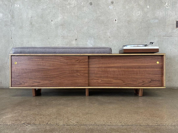 This is an original design, but with a strong influence of Mid Century | Danish Modern. The bench is roughly 67" long, 19" tall (22" tall if you include the cushion) and 15.5" deep. This version of the vinyl storage bench is functionally the same as my other version (the "Hi-Fi") but features exposed plywood edges and the cushion is secured to the top of the bench (not hemmed in by a border as in the other version). The wood is walnut-veneered plywood, with solid walnut legs. It is also available in other species such as white oak or cherry.