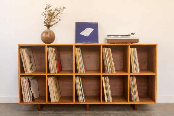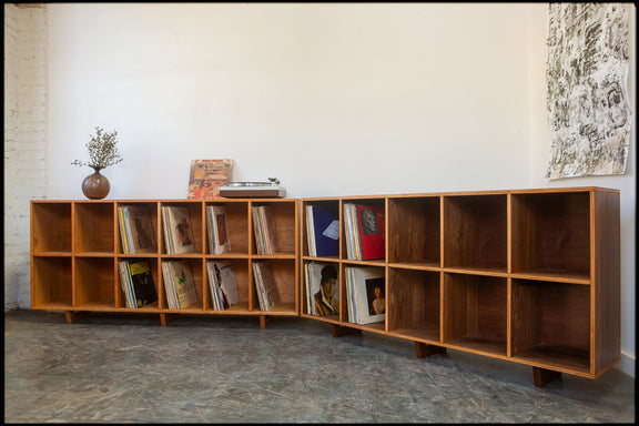 This is the "lofi" double decker vinyl storage unit. It's just like the lofi vinyl storage bench, except it has twice the vinyl storage and no cushion (it's too tall to sit on obviously). Each cubby is 12.5" wide x 13.5" tall, and each cubby holds around 75 to 85 records.