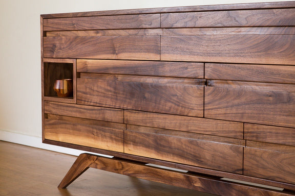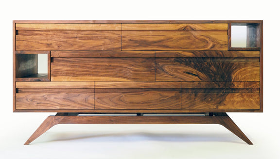 This dresser is an original design, inspired by the modern, minimal, clean aesthetic of mid century/ Danish modern. It has seven drawers that glide on soft-close hardware for the utmost in smooth operation, and the two cubbie openings are there to be filled by your imagination. The dresser is 60" wide, 23" deep and 30" tall. It is built from walnut and incorporates mortise and tenon joinery (i.e. strong joints that will last forever). It is has a hand-rubbed oil finish that leaves a beautiful lustre (without being super shiny). The drawers are built from baltic birch with dovetail joinery. The dresser is built entirely by hand right here in Southern California. I can build this dresser without cubbies for a reduced price. I can also modify the dimensions for an increased price. Savings available for local buyers-inquire for details.