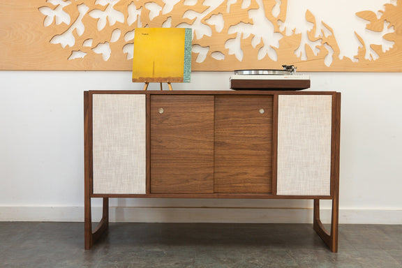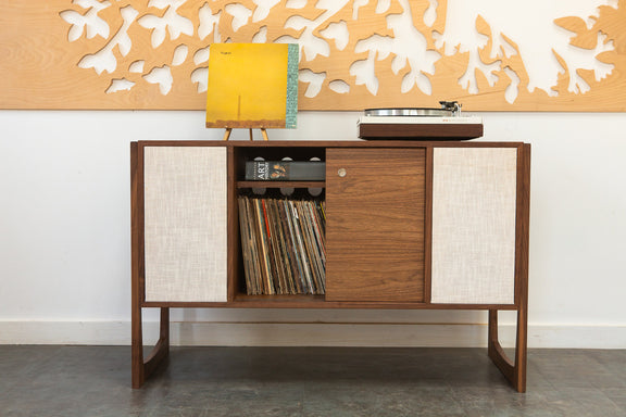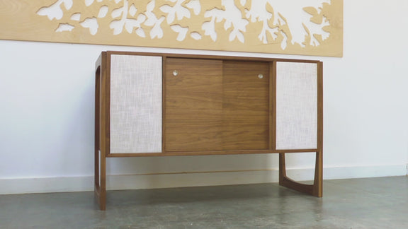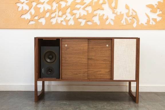 This is the scaled down version of the Douglas credenza. It's 48" wide, 20" deep, and 30" tall. It has speaker compartments to hide your book case speakers, and an open section in the middle with an adjustable shelf. This is the perfect stereo credenza for smaller spaces.