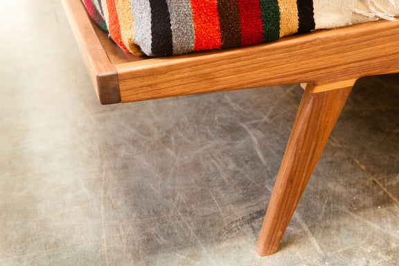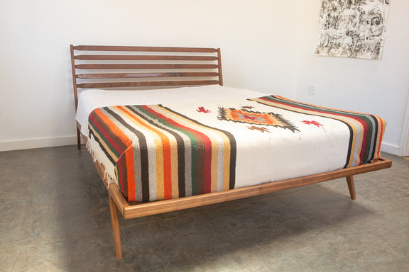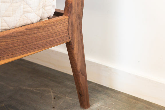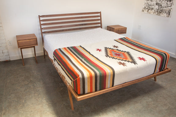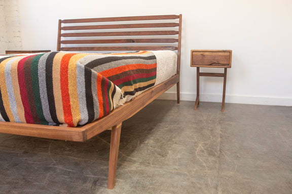 This bed is inspired by our love of all things Scandanavian, Mid Century Modern, minimal, elegant, and lovely. It concorporates aspects of many other Deeble designs, but it brings a slenderer touch in the lines, and it brings the front feet under the frame where you won't risk stubbing your toes (and this also brings down the footprint that it takes up in your bedroom). The slatted back rest brings the feel of an occasional chair with classic Mid Century Modern lines.