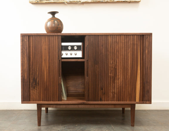 This credenza is a tambour door stereo console inspired by Mid Century Modern Design, a love of music and records, and our friend Lawrence who first commissioned this piece. It's built from beautiful, solid walnut (most of my pieces are a combination of plywood and hardwood, but this particular piece is entirely solid wood as necessitated by the design).